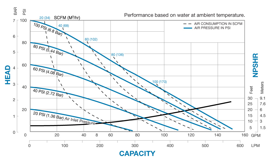 - 125 psi or 289 ft. of water (8.6 bar or 88 meters)
